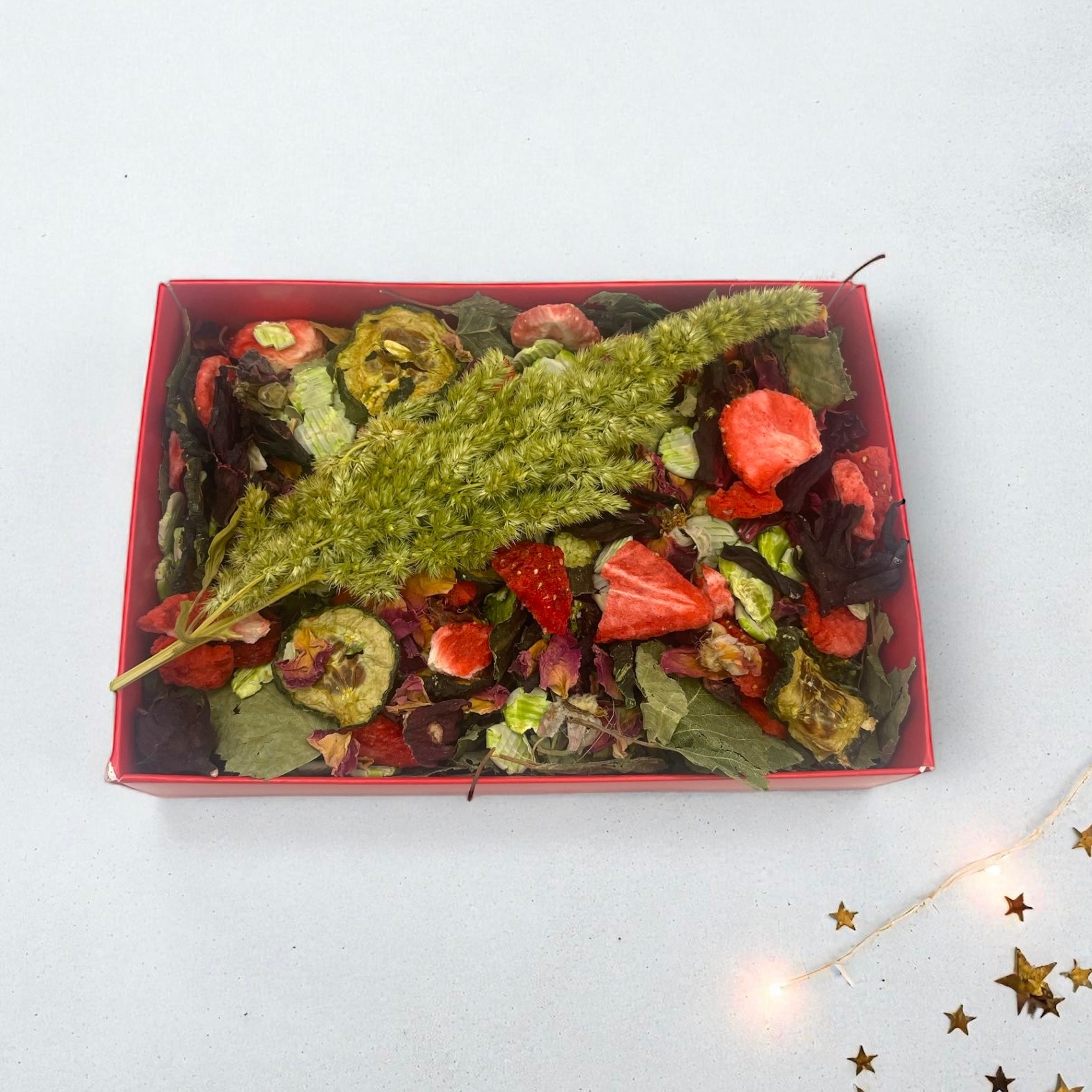 Cucumber, Strawberries, Pea Flakes, Hibiscus & Birch Leaves