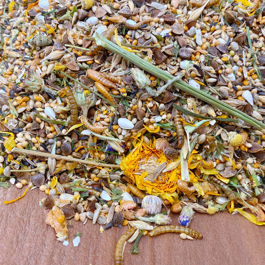 Buckwheat, plata millet, red millet, canary seed, barley, niger seed, grass seed, cardi, hemp seed, carrot seed, mealworms, Japanese millet, silver millet, green millet, blue poppy, marigold flowers, clover seed, dill stalks, fennel seed, brown shrimps, freshwater shrimps, camomile flowers, cornflower flowers.